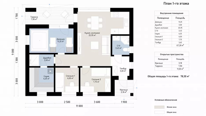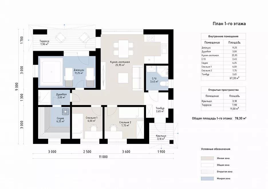 Особенностью проекта является просторная кухня-гостиная с панорамными окнами, создающая светлое и уютное пространство для отдыха. Конструкция из блоков обеспечивает долговечность, энергоэффективность и надежность. Внутренние помещения занимают 67 м² и включают кухню-гостиную площадью 26 м², джакузи 11 м², сауну 6 м², душевую 3 м², один санузел и две спальни площадью 6 м² и 8 м². Дополнительно проект предусматривает открытую террасу площадью 11 м², которая идеально подходит для отдыха на свежем воздухе. Проект «КВ-99» создан для тех, кто ценит функциональность, уют и современный дизайн. Эта баня станет отличным выбором для семейного отдыха, дружеских встреч или расслабления в кругу близких.
