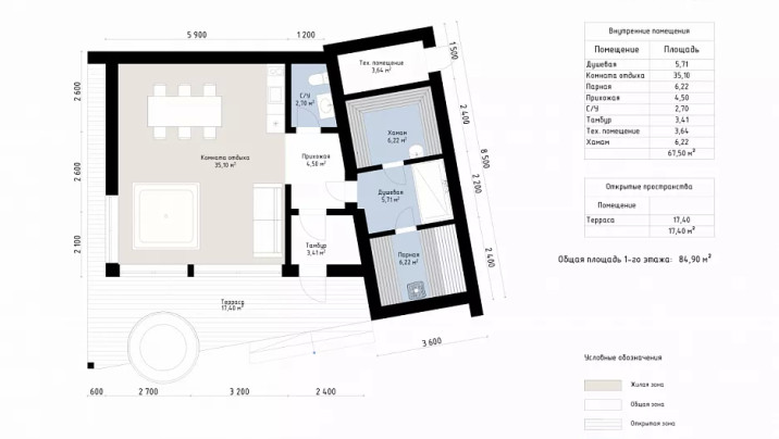 душевая, сан-узел, кухня, подсобное помещение, большая зона отдыха