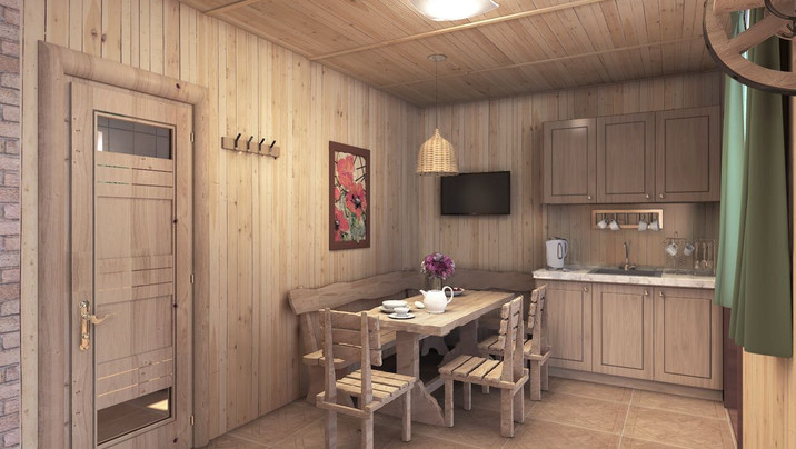 душевая, сан-узел, кухня, подсобное помещение, большая зона отдыха