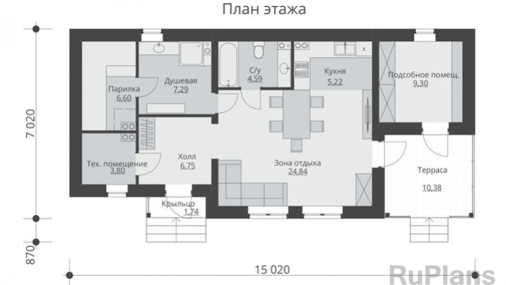 душевая, сан-узел, кухня, подсобное помещение, большая зона отдыха