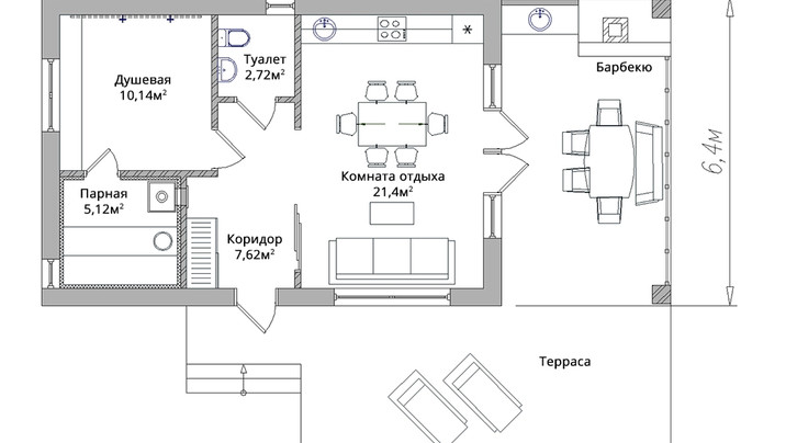 душевая, сан-узел, кухня, подсобное помещение, большая зона отдыха