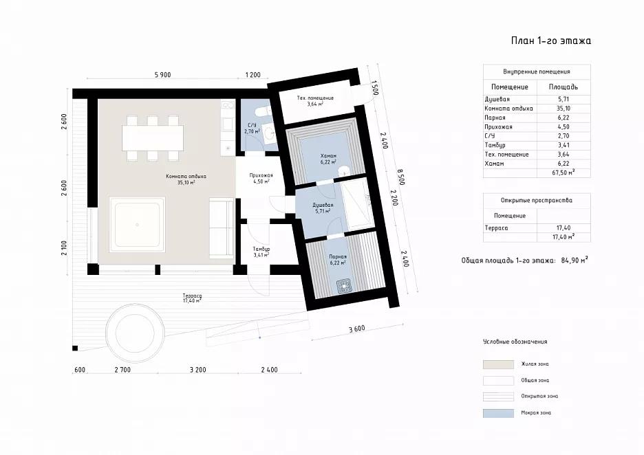 душевая, сан-узел, кухня, подсобное помещение, большая зона отдыха