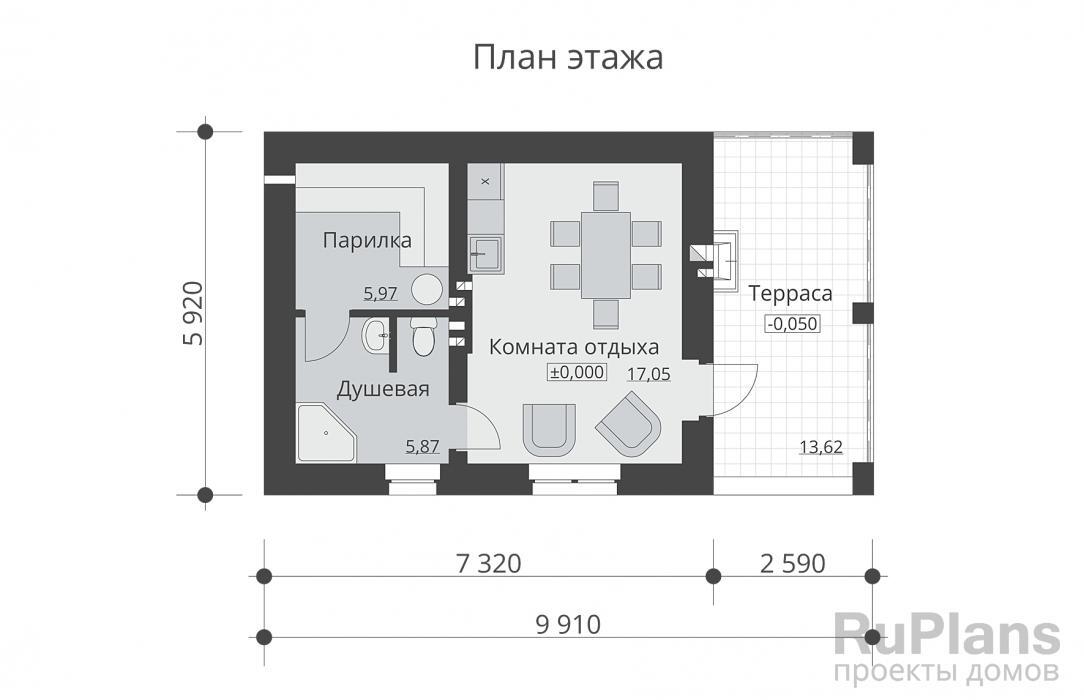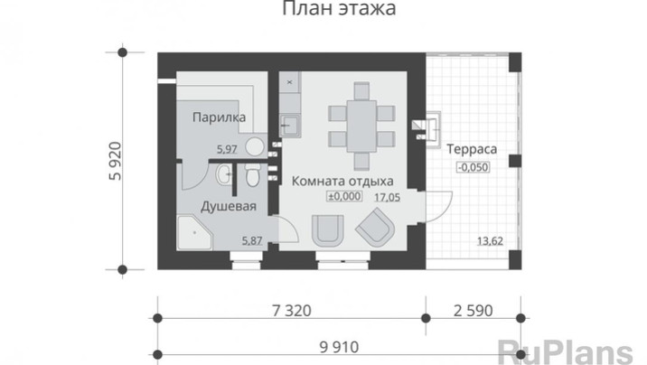 душевая, сан-узел, кухня, подсобное помещение, большая зона отдыха