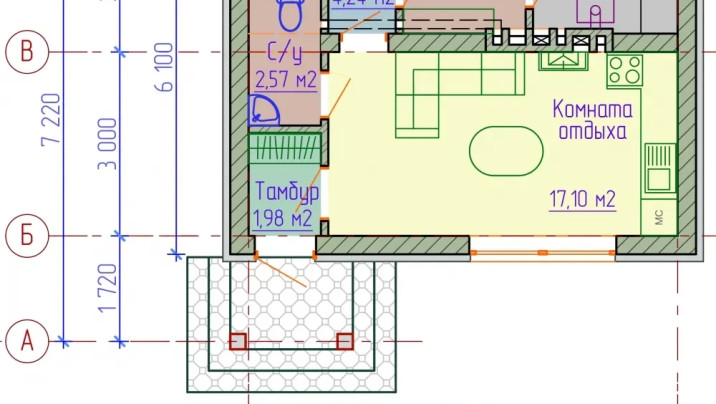 душевая, сан-узел, кухня, подсобное помещение, большая зона отдыха