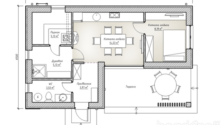 душевая, сан-узел, кухня, подсобное помещение, большая зона отдыха