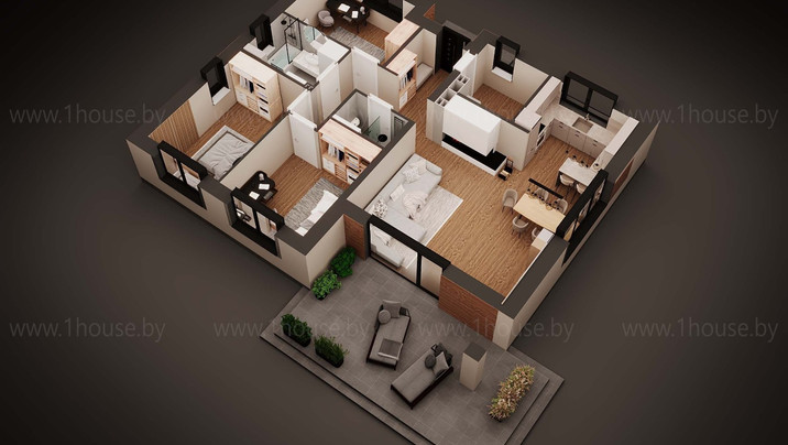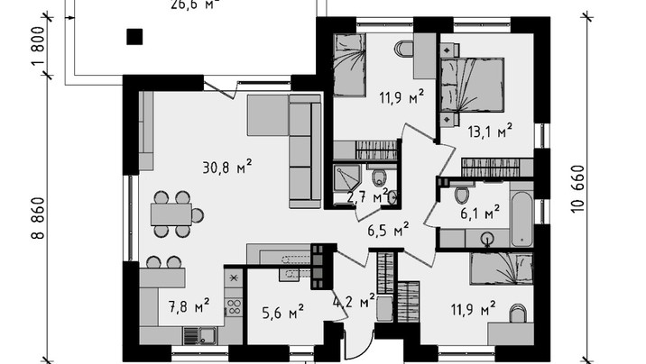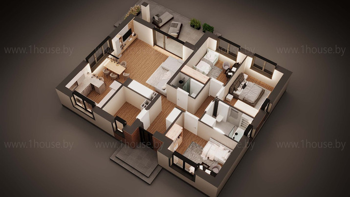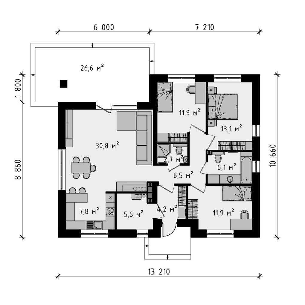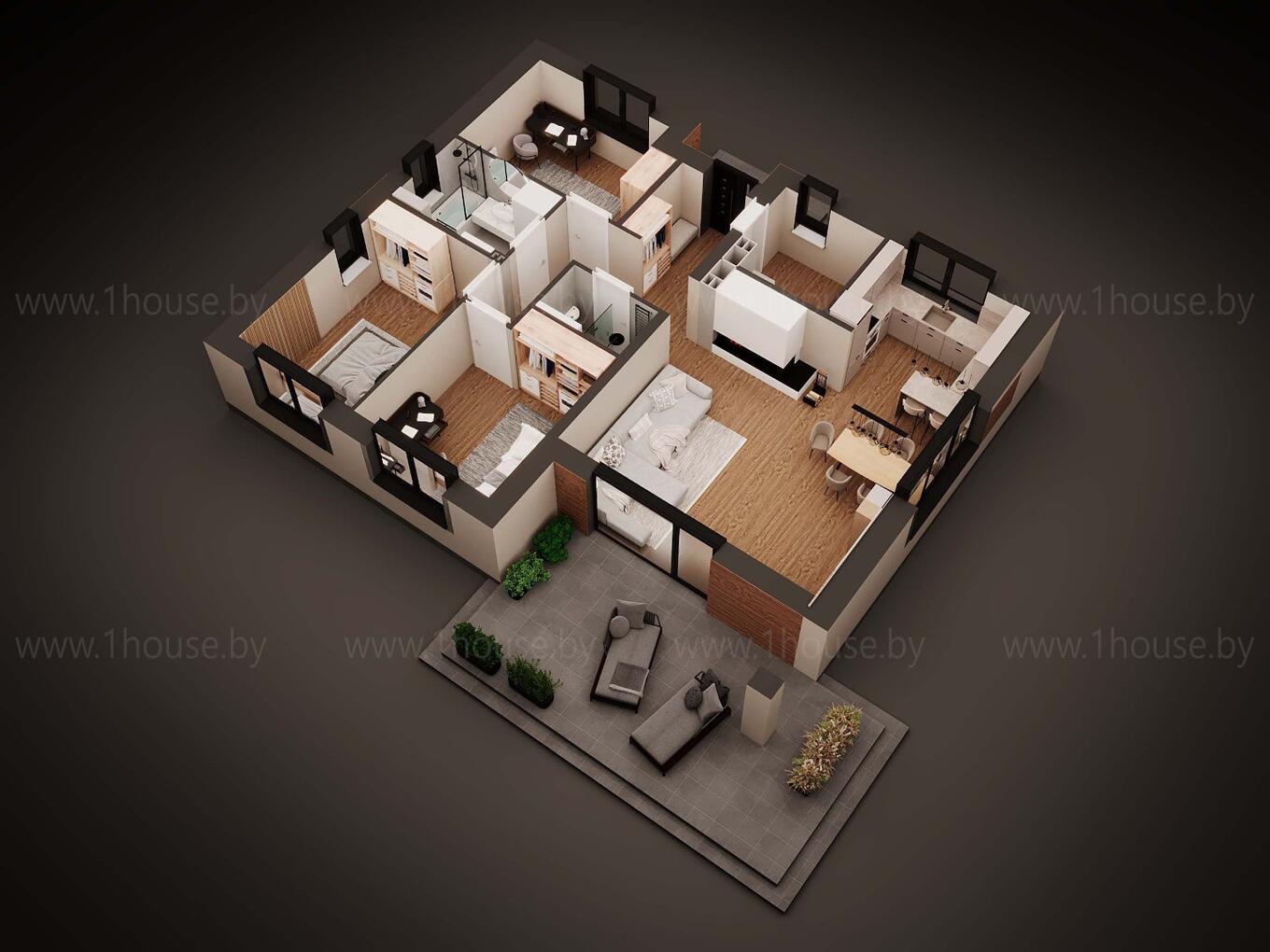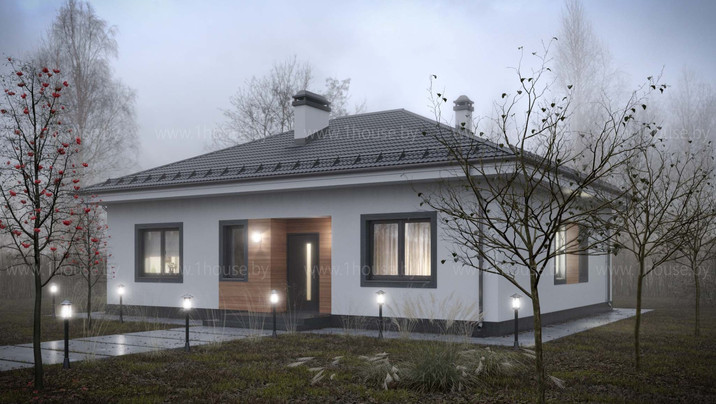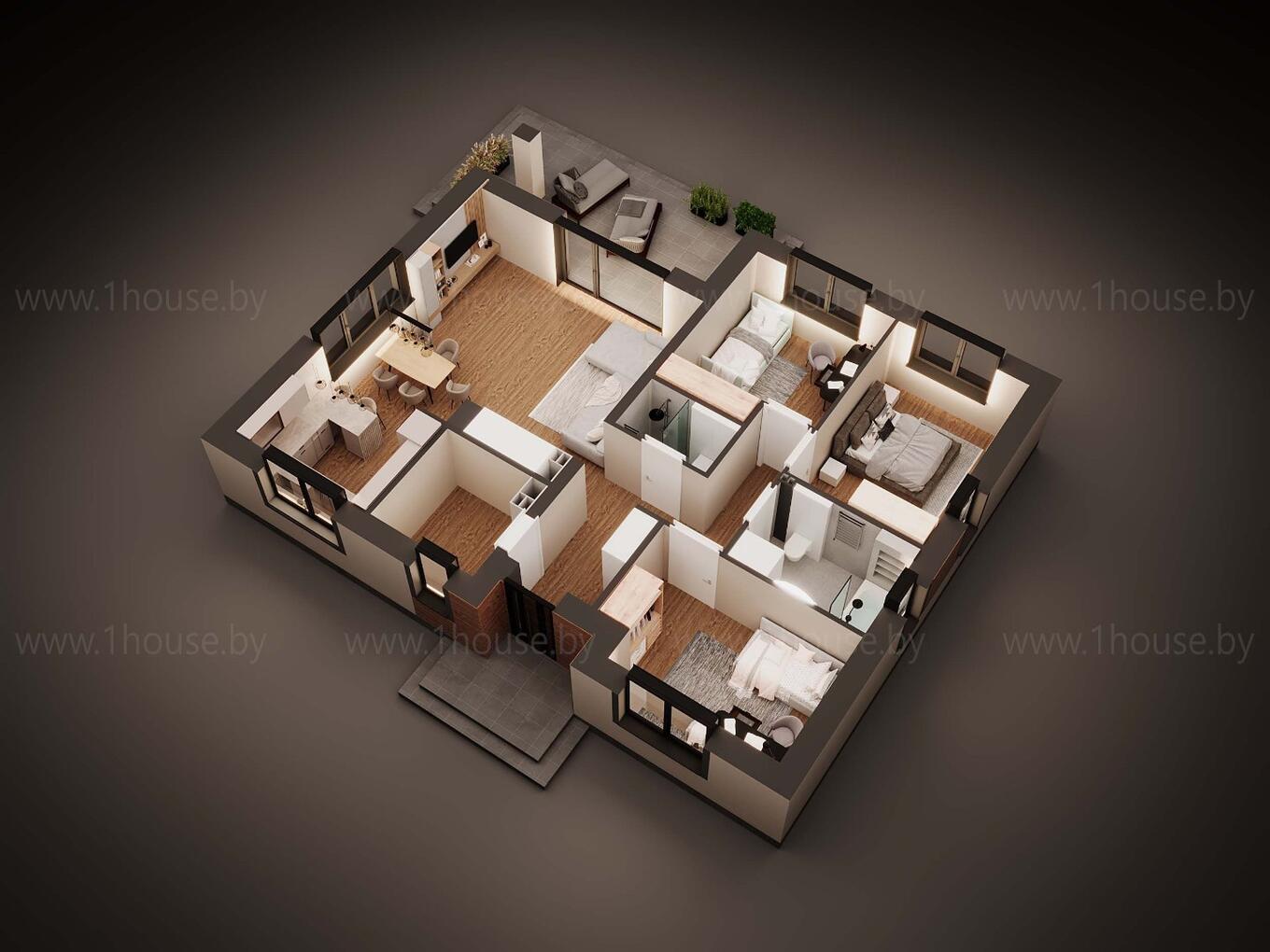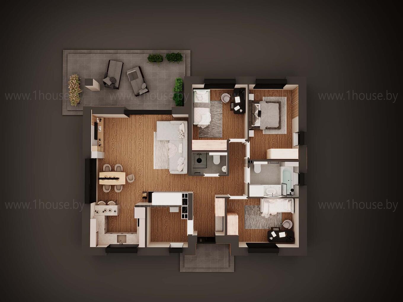 - ЧК-01. Одноэтажный дом с тремя спальнями 13.3*10.6 м.